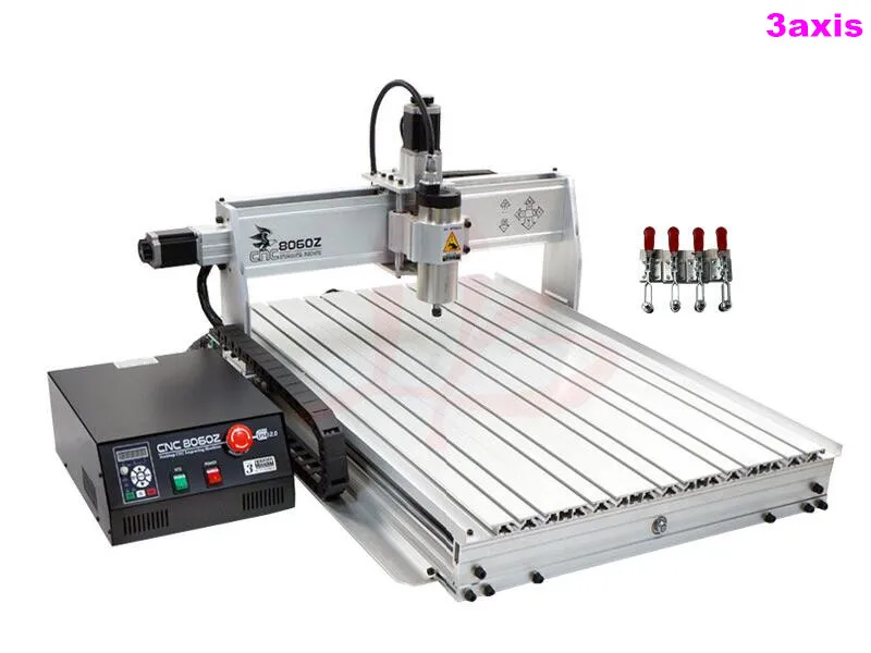 [32869928481] 2200W spindle 3axis CNC 8060 ER20 collet USB portCNC Router machine Engraving Drilling and Milling Machine Introduction The CNC router is suitble for Industry, Technology Research, Advertising Design, Arts Creation, Teaching, Student Project and Hobby Purposes. The cnc router is designed for large area engraving work such as Industrial or Hobby Prototype Building, Building Model Making, PCB, Advertising Signs, Artwork, Crafts, Aircraft Models, RC Model parts, etc. So, you can do engraving work at office or home. Model and Technical Parameters MODEL 8060Z-2200W USB Attribute 3axis Axis 3axis Interface USB port Limit switch Yes Tool auto-checking With control handle No Spindle Motor: 2200W Type of screw Ball screw Weigh 84 Machine Dimensions: 1120X880X520mm Rack material: 6061 and 6063 Hard aluminum alloy (The unique and dedicated mold extrusion profiles, Let counterfeiters dwarfs.) Engraving area: 790X585mm Z-Axis Stroke: 65mm, Engraving depth depends on the length of the tool edge Acceptable material thickness: ≤ 90mm Rail type: Chromeplate shaft + Linear Bearings, Surface hardening 61HRC Type of screw: Ball screw 1605, Pitch 4mm Spindle motor: 2200W Powerful Brushless frequency spindle Collet type: ER20 Collet Stepper motor and drive: 60BYGH-4.2A, Each axis independently driven Maximum operating speed: 4000mm/min (Engraving speed: 300-3000mm/min) Repeat positioning Accuracy: 0.03mm Software Compatability: Mach3/Emc2/Kcam, (Type3,Wentai, ArtCAM, coppercam) Command code: G code/.nc/.ncc/.tab/.txt Packing list:1× Engraving machine1× Control box1× Power cable1× USB port cable1× Tool package4× clamps1× tool auto-checking instrument1× water pump1× CD of manual and software MACH3 (if not get, may be lost in customs, please contact us)